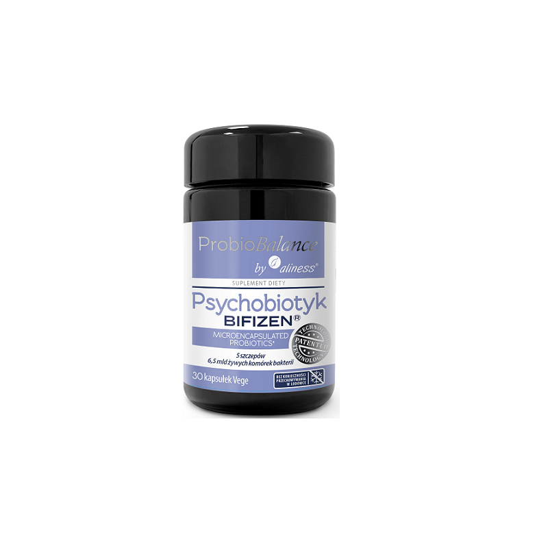 Suplement diety ProbioBalance Psychobiotyk zawiera 6,5 miliardów bakterii w każdej kapsułce w opatentowanym i przebadanym składzie BIFIZEN®. Każda bakteria została pokryta podwójną warstwą lipidową zapewniającą skuteczną barierę i umożliwiającą bezpieczne przechodzenie bakterii przez kwaśne środowisko żołądka, aby dotrzeć do jelit w stanie nienaruszonym, gdzie ma wykazywać swoją aktywność biologiczną.